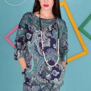 Эффектное платье свободного кроя с заниженной линией плеча и рукавами 3/4. Рукава отделаны манжетами и неординарными защипами. Модель с разрезной спинкой застегивается на пуговицы. Изюминкой платья являются карманы расположенные на линии бедер.